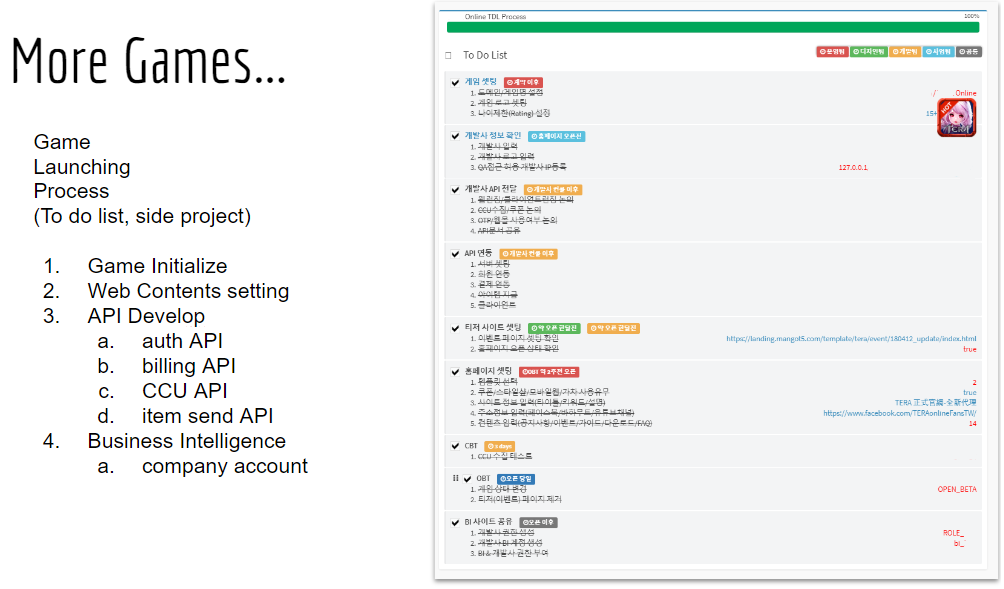 사이드 프로젝트로 게임 런칭프로세스를 한눈에 파악 할 수 있는 기능을 개발하였습니다.