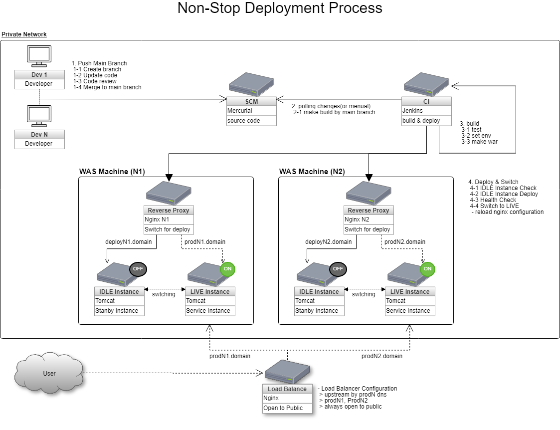 개요기존의 1 machine = 1 WAS Instance 구조로소스 패치시 해당 머신을 서비스에 사용하지 못하던 부분을 해소하고자동 배포를 구현하기 위해 고안된 구조입니다. In the before as 1 machine = 1 WAS Instance stru